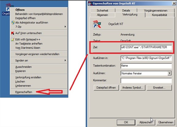 Öffnen Sie hierzu die Eigenschaften der Orgasoft-Verknüpfung, mit der Sie Orgasoft in der Regel starten, in dem Sie diese Verknüpfung markieren und mit einem Rechtsklick aus dem Kontexmenü die Eigenschaften aufrufen.