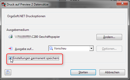 Nach dem Klick auf OK gelangt man zurück in das Fenster mit den Druckoptionen und kann dort nun ein Häkchen bei „Einstellungen permanent speichern“ setzen, damit diese Drucker-Einstellung für alle zukünftigen Drucker festgelegt ist:
