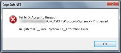 Erhalten Sie die Fehlermeldung "Fehler 5: Access to the path", so ist davon auszugehen, dass Sie keine Schreiberechte für den angebenen Pfad besitzen oder der angegebene Pfad von Ihrem Arbeitsplatz aus nicht erreichbar ist, dadurch ist es OrgaSoft nicht möglich, von Ihrem Arbeitsplatz aus die Protokolldatei zu schreiben.