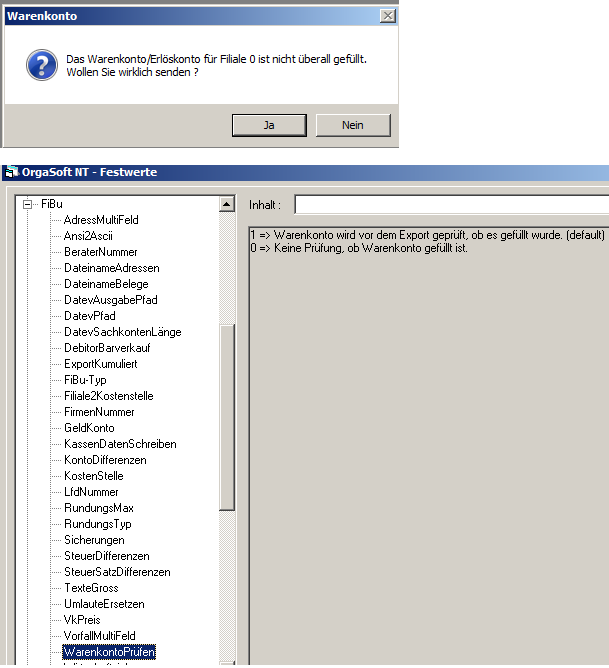 Orgasoft prüft, ob für alle Artikel bzw. Vorfälle das Warenkonto/Erlöskonto gefüllt ist.
