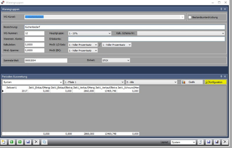 eine komfortable Möglichkeit der Warengruppenauswertung bietet Orgasoft.NET über Stammdaten/Artikel/Gruppen/Warengruppen. An dieser Stelle kann der Anwender über das Fenster Periodenauswertung die Darstellung der gewünschten Werte konfigurieren, siehe Screenshot.