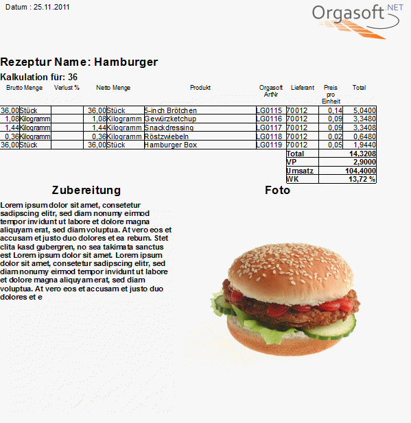 Mit Hilfe von einer UserQuery ( Eigene Abfrage ), welche Sie beim Artikel im Kontextmenü anbinden, können Sie sich solch einen Ausdruck Ihrer Rezeptur erstellen. Basis ist in diesem Beispiel die Rezeptur ( Stückliste, geht nachtürlich auch für einen Geschenkkorb ) in der ersten Stufe. Besonderheiten daran sind ein Multifunktionsfeld mit Zubereitungs-Anweisung ( im Beispiel die Nr. 102 ), es sind aber auch weitere Felder wie Kalorien, Inhaltsstoffe usw, denkbar, sowie das beim Artikel hinterlegte Bild. Die Küche soll ja auch wissen, wie es am Ende auszusehen hat