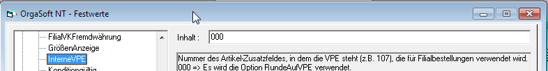 Nun kann für interne Bestellungen (also Filialbedarfsmeldungen) noch ein weiterer Festwert definiert werden - InterneVPE - mit welchem ein Multifeld angegeben werden kann, welches interne Verpackungseinheiten enthält, falls diese von den Verpackungseinheiten der Lieferanten abweichen. Wenn dieser Festwert definiert ist (also ein Multifeld für die interne VPE angegeben wurde), dann wird bei internen Bestellvorgängen nicht auf die Werte aus "RundeAufVPE" zugegriffen, sondern auf die Verpackungseinheiten, welche über "InterneVPE" hinterlegt sind.
