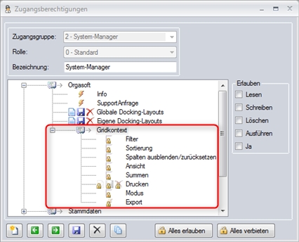 besteht die Möglichkeit, für die Gridkontextfunktion (rechte Maustaste in Übersichten) Berechtigungen zu setzen um eine erhöhte Datensicherheit zu gewährleisten.