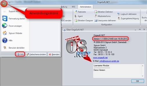 Die Versionsnummer von OrgaSoft.NET finden Sie über das Anwendungsmenü/Info
