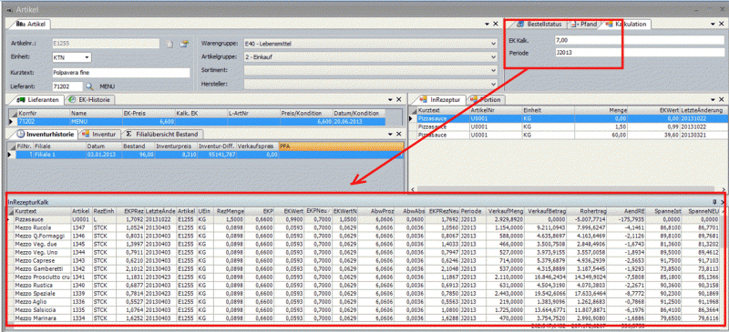 Der User erfasst dazu den kalkulatorischen EKPreis in ein Multifeld. Mit diesem EK werden alle Rezepturen neu berechnet und der Rohertragsverlust/-gewinn für die Verkaufsmenge einer Periode, die in einem zweiten Multifeld gewählt werden kann, ausgewiesen.