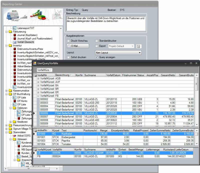Orgasoft.NET erkennt die Detail-Abfragen automatisch anhand des Namens; wenn die Master-Abfrage UserQueryVorfallÜbersicht heißt, dann muss die zugehörige Detail-Ansicht UserSubQueryVorfallÜbersicht heißen. Als Parameter sind alle Spalten der Master-Abfrage zulässig, d.h. wenn es in der Master-Abfrage eine Spalte ArtikelNr gibt, dann kann die Detail-Abfrage einen Parameter @ArtikelNr verwenden, der dann automatisch mit dem korrekten Wert gefüllt wird.