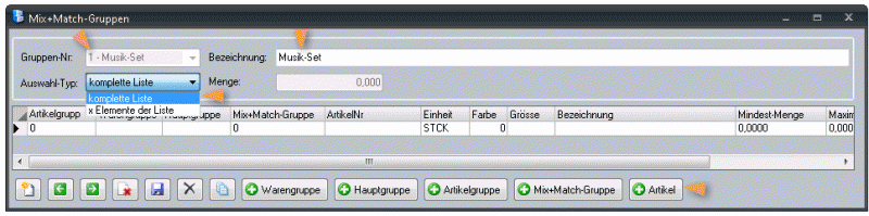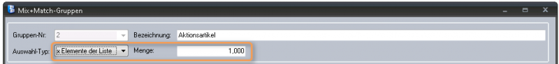 Unter Auswahl-Typ ist defaultmäßig „komplette Liste“ ausgewählt. D. h., es müssen alle Artikel der Mix+Match-Gruppe gekauft werden, damit der Rabatt gilt. Alternativ können Sie auch festlegen, dass der Rabatt ab einer bestimmten Anzahl an gekauften Artikeln gewährt wird.