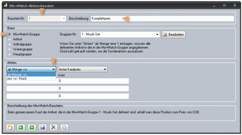 Wie die Rabatt-Aktion aussehen soll, legen Sie unter „Mix+Match-Bausteine“ fest. Zunächst tragen Sie wieder eine Nummer und Beschreibung ein, sodass Sie die Aktion später erneut verwenden können. Wählen Sie im Bereich "Basis" Ihre Mix+Match-Gruppe aus.