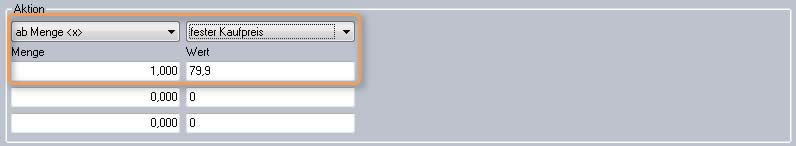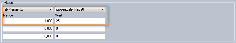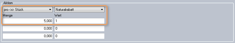 Unter Aktion geben Sie an, ob die Aktion pro gekaufter Artikelgruppe oder ab einer Menge gilt. Im ersten Fall bekommt der Kunde den Rabatt mehrmals. Im zweiten Fall gilt der Rabatt einmalig. Egal, wie oft der Kunde die Artikelgruppe kauft.