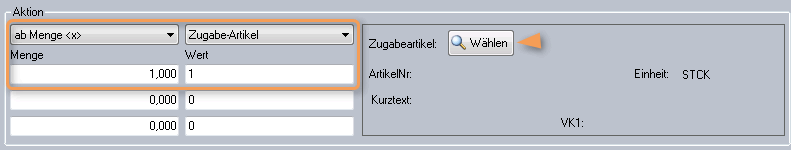 Als verkaufsfördernde Maßnahme können Sie zu jeder gekauften Artikelgruppe einen beliebigen Artikel in gewünschter Menge hinzugeben (z. B. 1 Kugelschreiber oder 5 Sticker). Wählen Sie dafür unter Aktion „Zugabe-Artikel“ und anschließend den Zugabeartikel aus der Datenbank des Warenwirtschaftssystems aus.