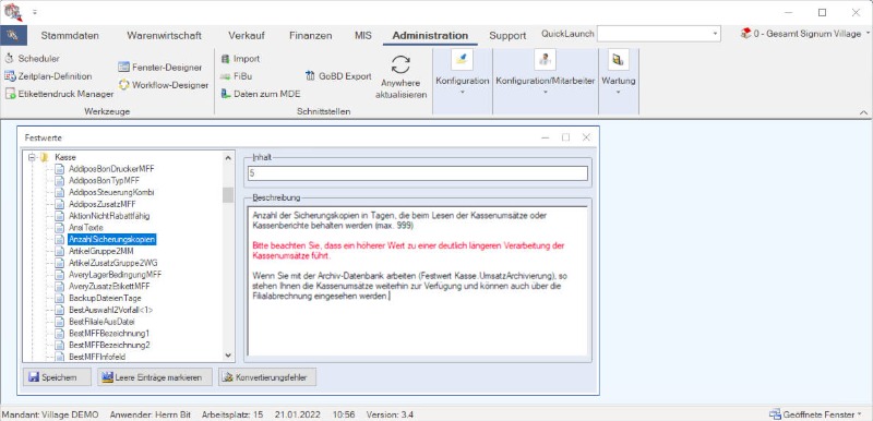 - Neu bei Kassen-Festwert: Anzahl Sicherungskopien wird für Anzahl Tage definiert