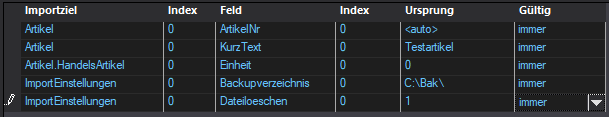 Ursprung: Hier tragen Sie z.B. 1 ein, wenn ein Backup erstellt werden soll, sobald die Daten komplett importiert wurden. Die hier möglichen Optionen werden Ihnen als Tooltip angezeigt, sobald Sie mit der Maus auf die ImportEinstellung "Dateiloeschen" zeigen.