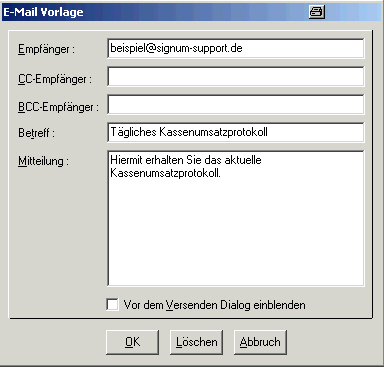 Dann muss an der Stelle unter 'eMail' die Angabe über die Mailadresse, Betreffzeile etc. gespeichert werden:
