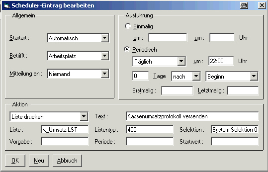 Und schließlich benötigt man den Scheduler-Eintrag. Geben Sie Listenname, Selektion, Vorgabe etc. ein. Welcher Listentyp einzutragen ist, finden Sie in der Online-Hilfe (z.B. 400 für das Kassenumsatzprotokoll).