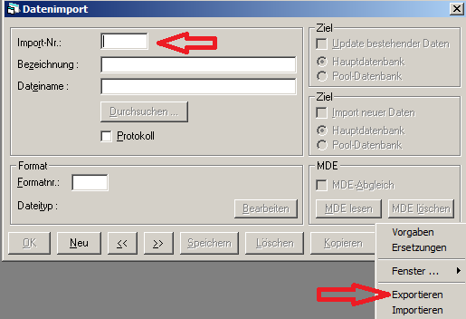 Wählen Sie den gewünschten Import aus. Über einen Rechtsklick können Sie aus dem Kontextmenü die Schaltfläche exportieren auswählen. Am besten exportieren Sie alles in ein neues Verzeichnis, da es sich um mehrere (5) XML Dateien handelt und Sie so leichter den Überblick behalten.